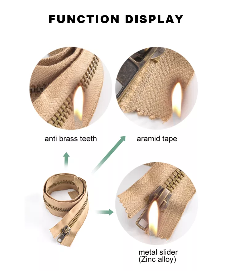 TRC brandbeständiga metalldragkedjor är tillverkade av högkvalitativa flamskyddade väv med utmärkta självsläckande egenskaper, vilket effektivt förhindrar väven från att brinna eller antändas i luften, vilket i grunden förbättrar säkerheten för kläder och utrustning. Dessa dragkedjor är kända för sin utmärkta värmebeständighet och tål kortvarig exponering för temperaturer upp till 300°C utan att krympa, spricka eller smälta. Deras stabila prestanda och varaktiga hållbarhet gör dem till ett pålitligt val för användning i tuffa miljöer med hög temperatur.