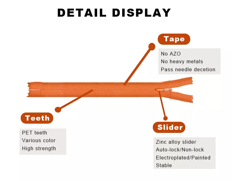 TRC Osynlig explosionssäker dragkedja(Normal Tape) erbjuder två typer av tejpalternativ: standardtygtejp och spetstygtejp.