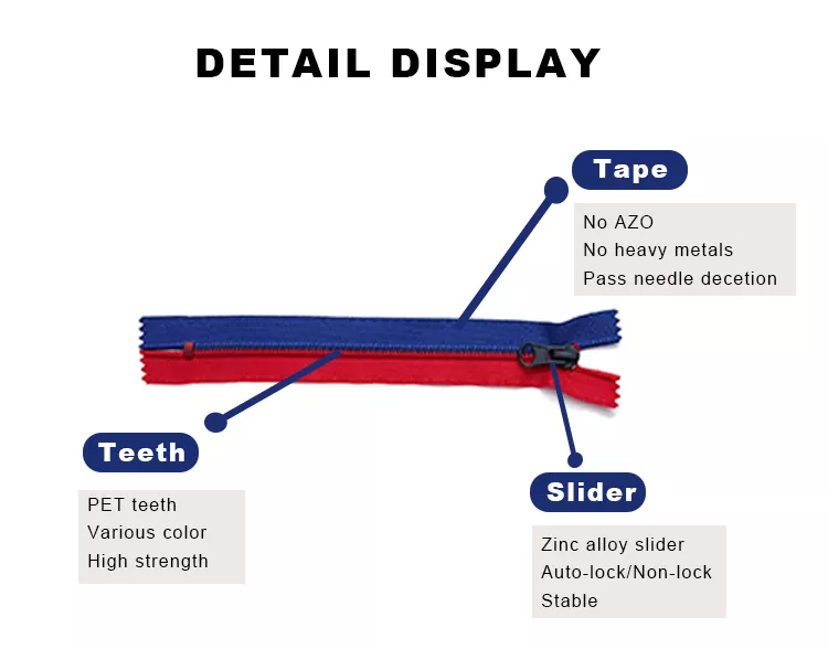 TRC nylon dragkedja kombinerar högkvalitativ nylon blixtlåstejp med robusta polyestertänder, vilket gör produkten både hållbar och smidig att använda, samtidigt som den tillåter enkel anslutning av två dragkedjor av samma modell (oavsett färg eller batch), vilket ger användarna en flexibel och bekväm upplevelse.