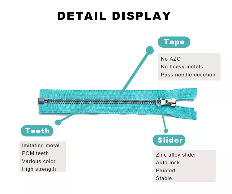 Tack vare deras sofistikerade estetik, flexibla design och omfattande anpassningsmöjligheter används TRC Plastic Zipper med specialformade tänder i stor utsträckning inom mode-, ytterkläder-, bagage- och sportartiklar. En exakt formningsprocess möjliggör en mängd olika tandprofiler, vilket säkerställer ett unikt utseende utan att kompromissa med funktionaliteten.