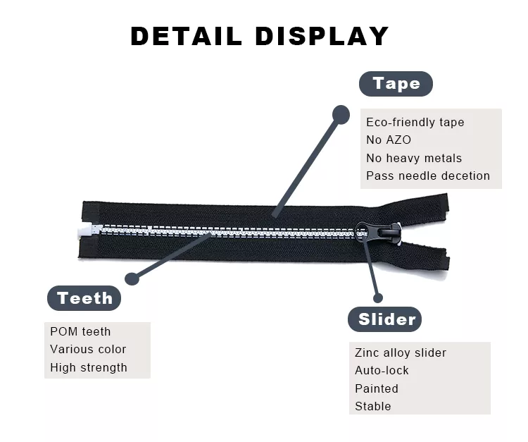 TRC återvunnen plast dragkedja är tillverkad av lågkolhaltiga, miljövänliga material kombinerat med förnybara webbing. Samtidigt som den bibehåller den mjuka känslan och hållbarheten som är typiska för hartsdragkedjor, innehåller den också ett distinkt grönt element, vilket gör det inte bara höghållfast, deformationsbeständigt och slitstarkt, utan också effektivt tillgodose behoven av hållbara inköp. Det är ett idealiskt val för dem som söker en balans mellan prestanda och miljövärde.