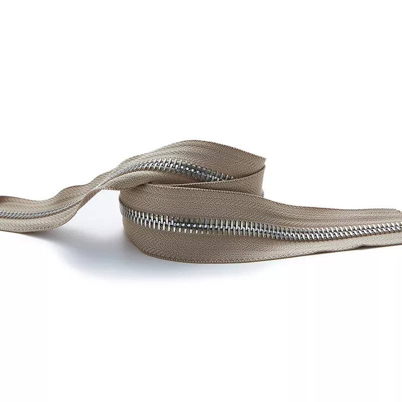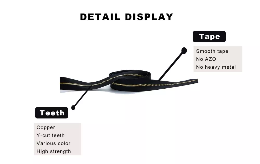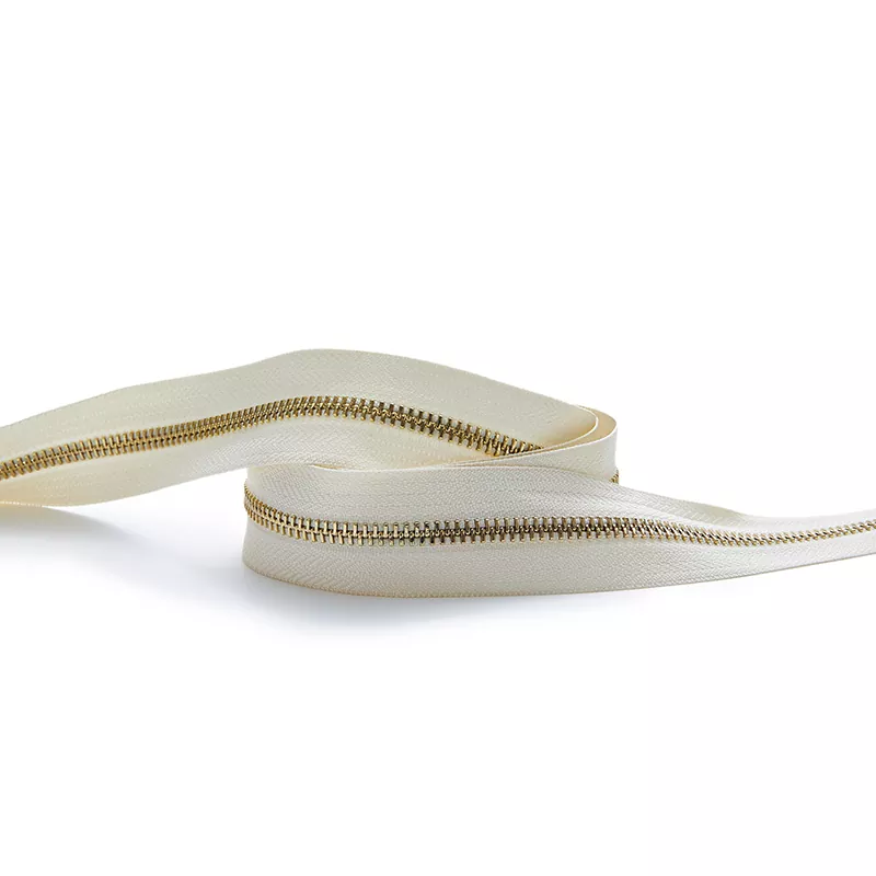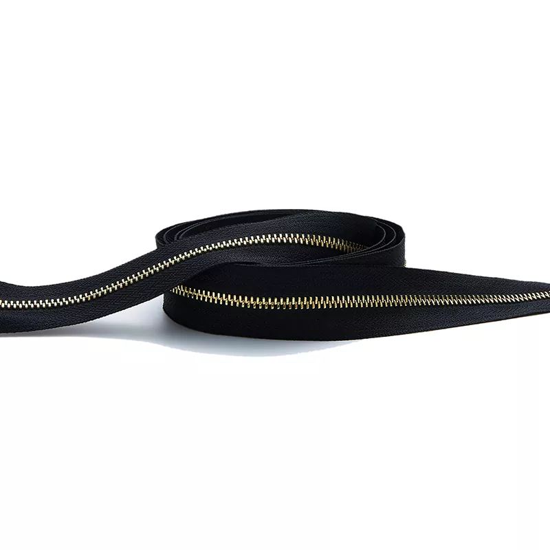 TRC standard metalldragkedja använder höghållfasta mässings- eller nickeltänder, vilket ger den utmärkt slitstyrka, tvättbeständighet och värmebeständig strykprestanda. Dessutom finns den i populära färger som champagneguld, vilket gör den mycket lämplig för jeans, jackor och olika andra typer av kläder.