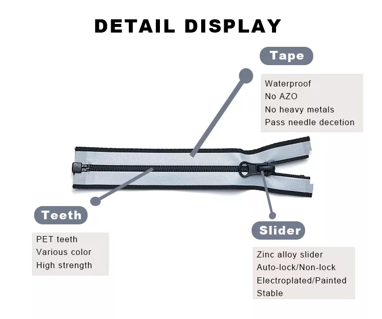 TRC vattentåliga nylondragkedjor är gjorda av nylontänder med hög densitet och förstärkt polyestertejp, överlagrade med en hållbar TPU- eller PU-film. Detta skapar en sömlös barriär som ger effektiv vattenbeständighet samtidigt som blixtlåsets flexibilitet och smidiga funktion bibehålls. Denna produkt är designad för utomhusbruk och högpresterande applikationer och erbjuder hållbar nötnings-, korrosions- och deformationsbeständighet. Oavsett om det används i jackor, sportkläder, ryggsäckar, tält eller skyddsutrustning, uppnår TRC vattenavvisande nylondragkedja en idealisk balans mellan funktionellt skydd och modern design, vilket säkerställer att varje detalj är både snygg och funktionell.